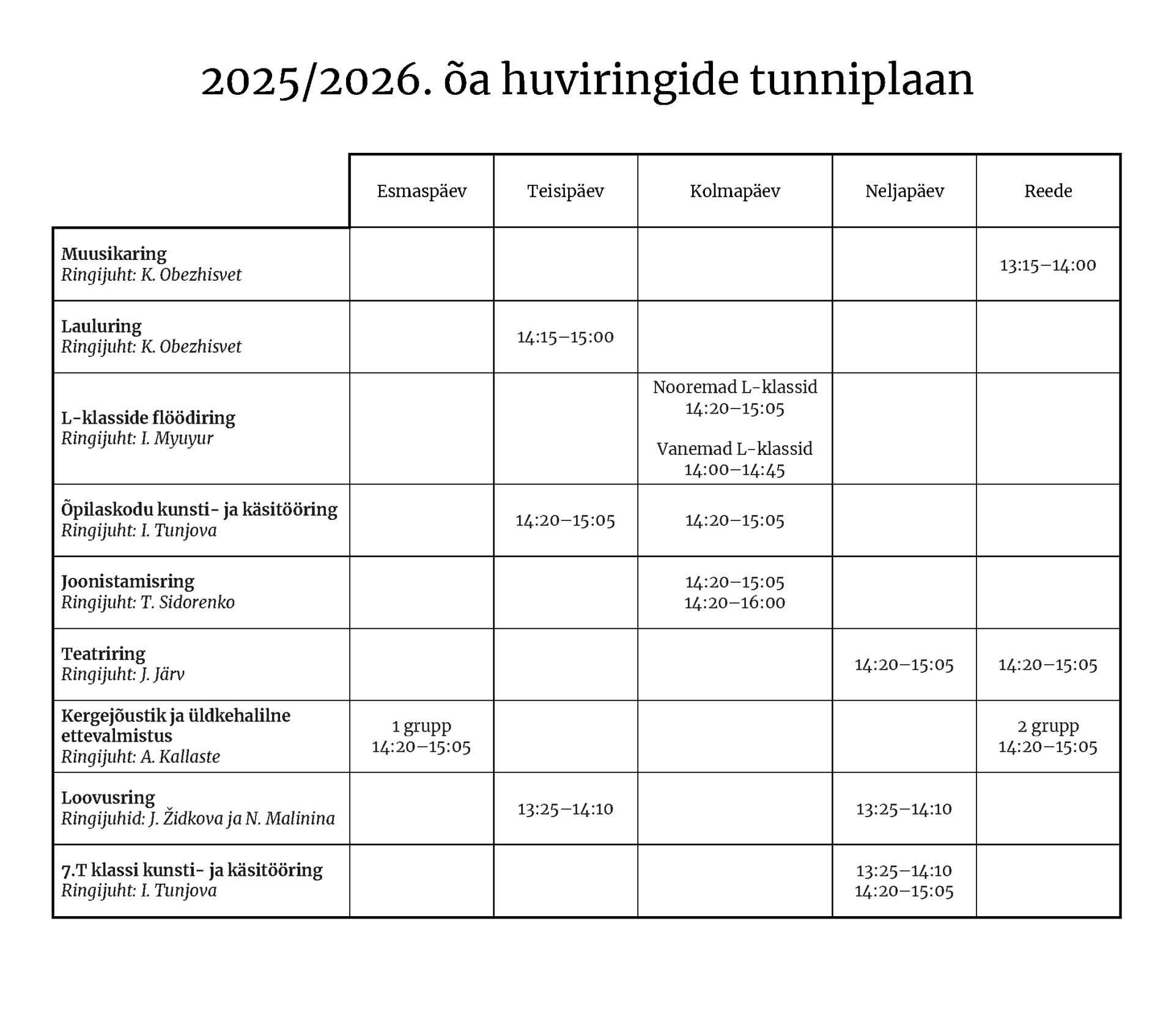 Meil koolis töötavad tasuta huviringid: arvutiring, koor ja kooliorkester, “Teeme ise”, teatriring, joonistamine, loovtegevus, tantsuring.